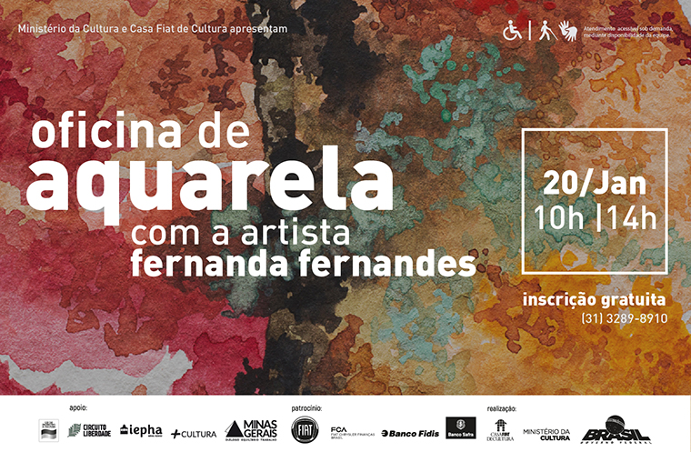 No dia 20/01 (sábado) a artista visual Fernanda Fernandes, que está com a exposição Contaminações Pictóricas, irá ministrar uma oficina de aquarela em dois horários: pela manhã para família e crianças até 12 anos e a tarde para jovens e adultos maiores de 12 anos. As inscrições podem ser feitas do dia 15 até 18/01 pelo telefone (31)3289-8910.