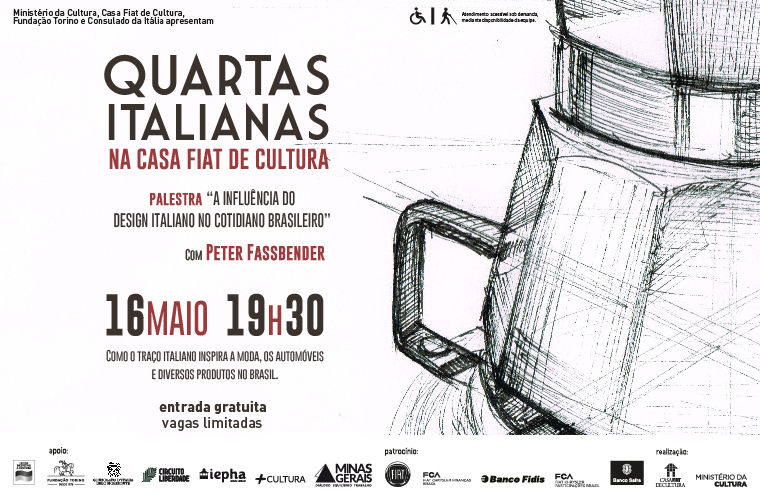 O design faz parte do nosso cotidiano – nas construções urbanas, na moda, nos móveis e nos objetos que utilizamos. Em todo o mundo a Itália é conhecida por um design que se destaca na forma e no sentido estético. Para falar sobre este assunto a Casa Fiat de Cultura traz no dia 16 de maio o renomado designer Peter Fassbender, para participar do programa de palestras Quartas Italianas. Com o tema “A influência do design italiano no cotidiano brasileiro” Fassbender mostrará como o traço italiano mudou a moda, os automóveis e diversos produtos no país. A palestra será realizada das 19h30 às 21h com entrada gratuita e espaço limitado a 200 lugares. Distribuição de senhas a partir das 18h30.