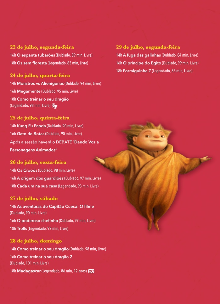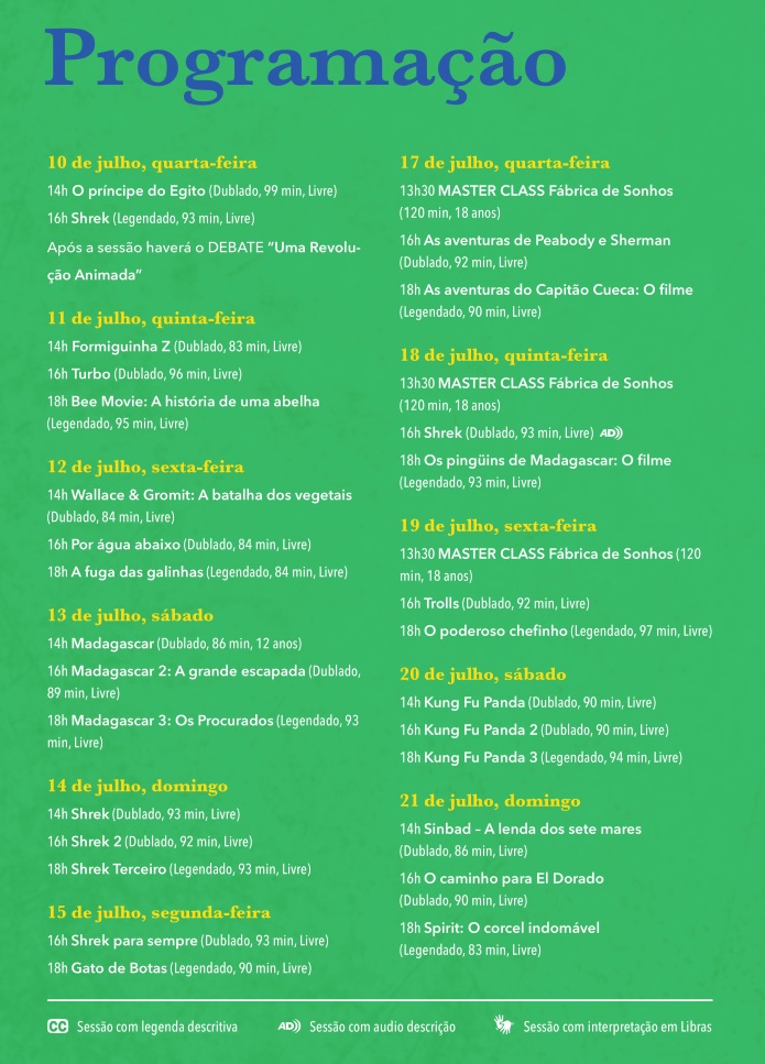 Estão inclusos na agenda da mostra, três sessões especiais com recursos de acessibilidade: Shrek (audiodescrição, 18/07, às16h), Como Treinar o seu Dragão (interpretação em libras, 24/07, às 18h) e Madagascar (legenda descritiva, 28/07, às18h).