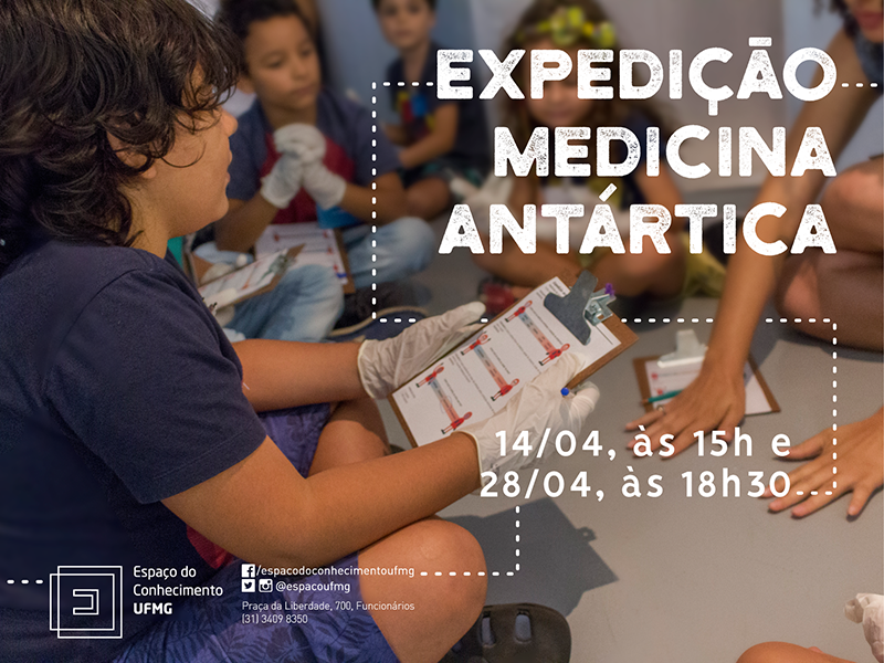 Expedição Medicina Antártica Quando: 14 de abril, às 15h; e 28 de abril, às 18h30 Participação: gratuita mediante retirada de bilhete na recepção Classificação: a partir de 06 anos Onde: Espaço do Conhecimento UFMG – Praça da Liberdade, 700, Funcionários, BH |