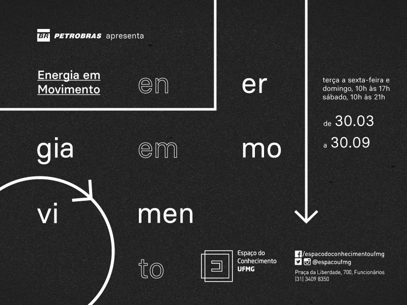 Resultado de uma parceria com a Petrobras e com curadoria do professor da Escola de Arquitetura da UFMG Jose dos Santos Cabral Filho, a mostra é um convite a um mergulho pelas interseções entre energia, movimento e tecnologia. O passeio começa pelo Gerador de Curiosidades, uma sala escura em que argolas são acionadas pelos visitantes e acendem palavras em caixas penduradas pelo teto. Em seguida, é possível fazer um percurso pela Floresta de Verbetes, onde tecidos também suspensos apresentam conceitos relacionados ao tema na voz de especialistas de áreas diversas, como física, música, política, turismo, economia e artes digitais.