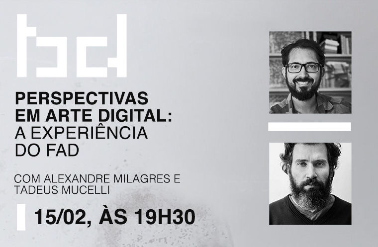 Vivemos o digital não apenas como aparato, mas como uma cultura, fazendo parte do nosso cotidiano, das nossas buscas, dos nossos planos, das nossas relações sociais e da nossa vida profissional. No bate-papo “Perspectivas em arte digital: a experiência do FAD”, que acontece no dia 15 de fevereiro, às 19h30, a arte digital será abordada em seu potencial simbólico e reflexivo sobre o momento tecnológico que vivemos. Será apresentada a experiência da equipe organizadora do FAD – Festival de Arte Digital, representada por Alexandre Milagres e Tadeus Mucelli, que irá abordar como a arte digital mapeada e exposta ao longo dos últimos dez anos, em cada edição do evento, tem apontado alguns rumos sobre as questões vividas não apenas pela arte, mas também pela ciência e por cada visitante das galerias.