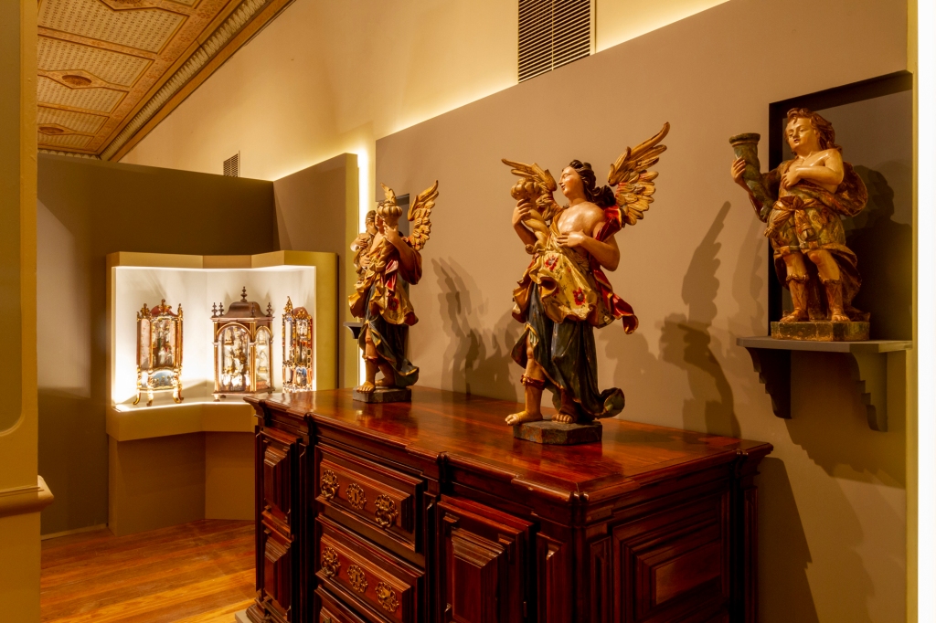 - Sala das Colunas – local dedicado à exibição de peças de arte sacra, a maioria datada dos séculos 18 e 19, resultado do trabalho de artistas portugueses e brasileiros. São imagens, objetos de culto, fragmentos de altares e mobiliário provenientes de igrejas paroquiais, capelas, ermidas e residências particulares que, embora continuem sendo para alguns objetos de fé e devoção, passam a assumir o caráter de obra de arte ao serem incorporadas à exposição de longa-duração. Para desenvolvimento desse módulo, buscou-se a narrativa histórica, tendo como fio condutor a trajetória de Jesus Cristo, figura central do cristianismo.